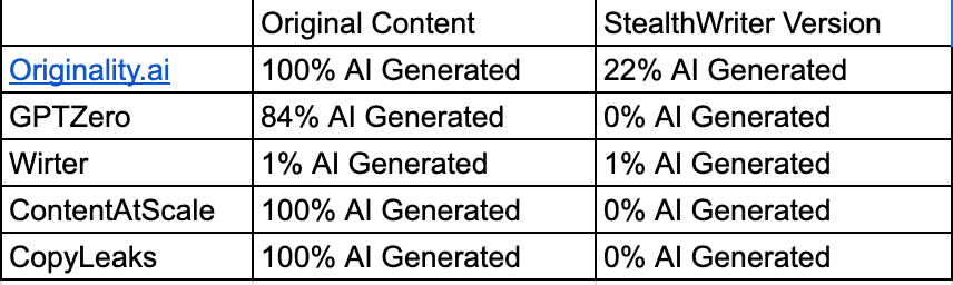 However, when we put that same content through the StealthWriter tool, we were presented with a completely different story, with Originality.ai as the only tool that thought there might be a small chance the content was AI-generated.